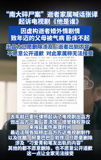 12月17日,一位网友自称“南大碎尸案”尸骸刁爱青的姐夫,发文喊话演员张译,称其主演电视剧《他是谁》给被害东说念主家属带来极大伤害。