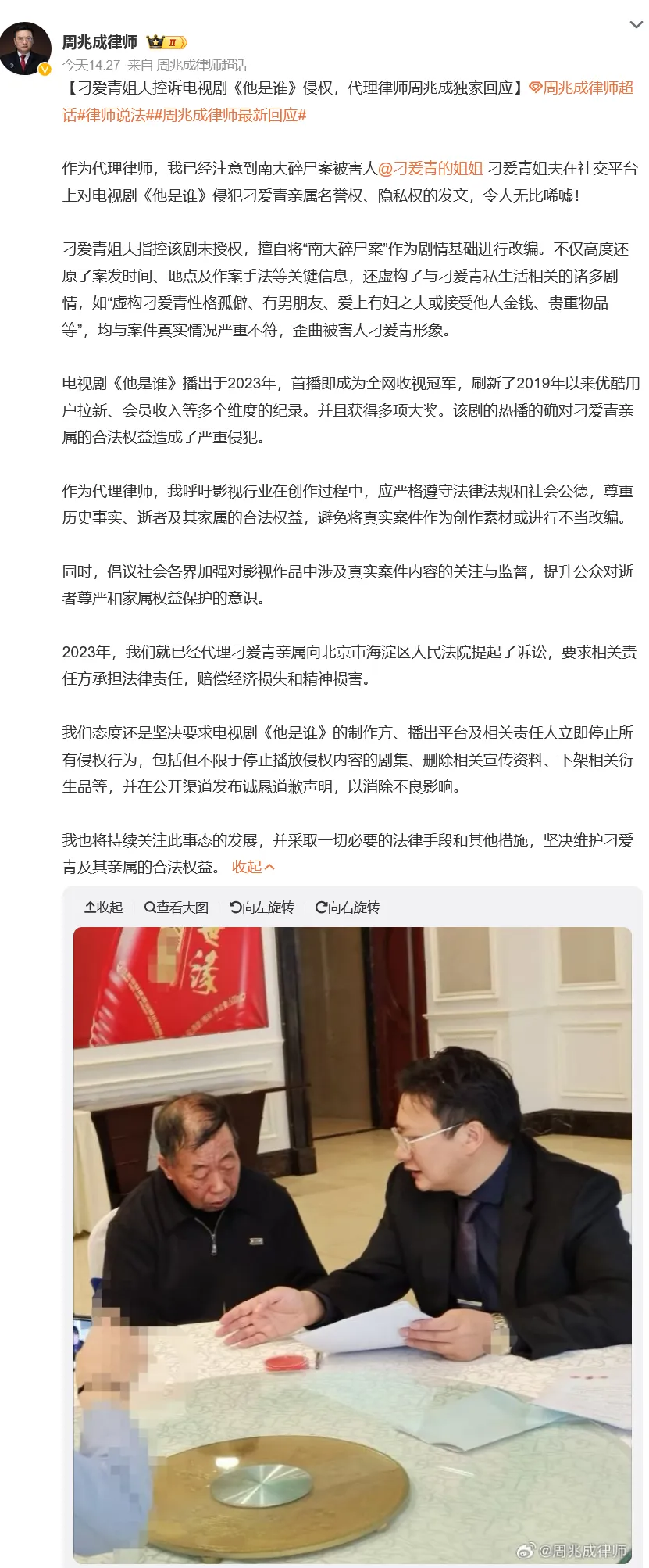 周兆成称该剧的热播确切对刁爱青支属的正当权利形成了严重侵略:“我命令影视行业在创作流程中,应严格遵命法律门径和社会公德,尊重历史事实、尸骸偏激家属的正当权利,幸免将着实案件看成创作素材或进行不妥改编。同期,倡议社会各界加强对影视作品中波及着实案件施行的眷注与监督,擢升公众对尸骸尊荣和家属权利保护的意志。”