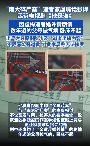 他称电视剧中的“余爱芹案”与“南大碎尸案”高度通常,不仅案发期间、被害东说念主的名字饱胀一致,就连凶犯恣虐的作案手法也被搬上荧幕,更让家属难以罗致的是剧中还杜撰了“余爱芹婚外情”的剧情,年老的父母被气病,卧床不起。